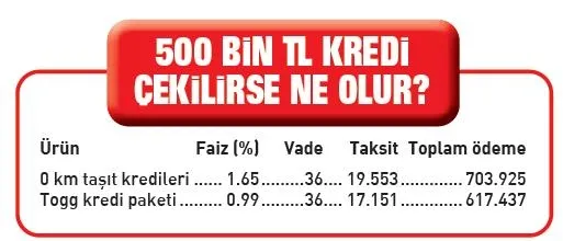 Cumhurbaşkanı Erdoğan’ın müjdesini verdiği ucuz Togg kredisiyle ilgili çalışmada sona gelindi. 500 bin TL kredi çeken vatandaş, şu andaki faiz oranına göre aylık taksitte 3 bin, toplamda da 90 bin TL avantaj kazanacak