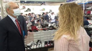 CHP Genel Başkanı Kemal Kılıçdaroğlu, Antalya’da yaptığı esnaf ziyaretinde ayakkabı satıcısına “İşle...