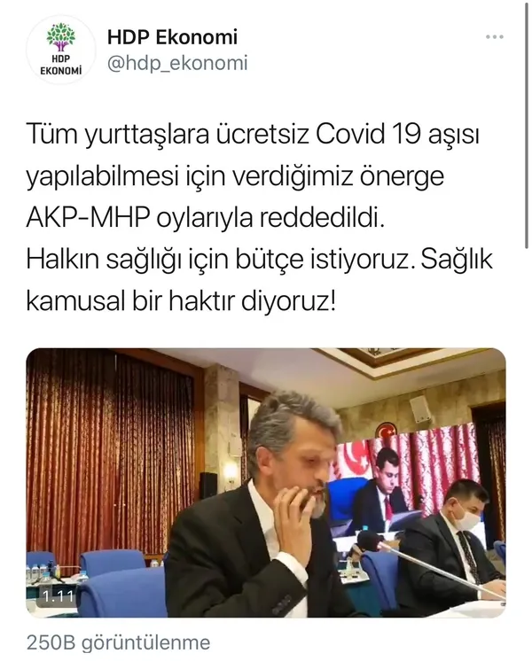 Halkların Demokratik Partisi (HDP) tüm vatandaşlara ücretsiz Kovid-19 aşısı yapılabilmesi için TBMM Plan Bütçe Komisyonu'na önerge verdi. Plan Bütçe Komisyonu'nda HDP Garo Paylan komisyonda ücretsiz olarak aşılanma istediklerini, halkın sağlığı için bütçenin artırılmasını talep ettiklerini ifade etti. Önerge AK Parti'nin ve Milliyetçi Hareket Partisi'nin (MHP) verdiği oylarla reddedildi.