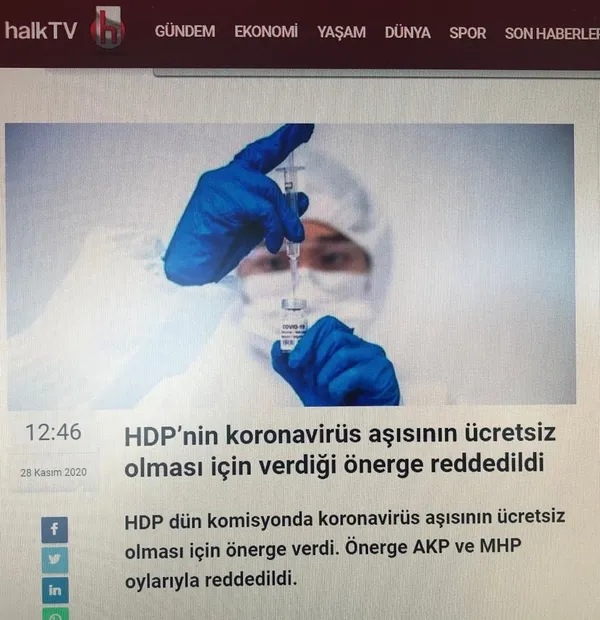 Sağlık Bakanı Fahrettin Koca’nın vatandaşlara yapılacak aşılardan herhangi bir ücret almayacağını duyurmasına rağmen, TBMM Plan Bütçe Komisyonu’na aşının ücretsiz olması için HDP, önerge verdi. Önerge, vatandaşlara yapılması planlanan aşıların halihazırda ücretsiz olacağı nedeniyle reddedildi. Cumhuriyet Gazetesi, Halk TV ve Oda TV ise Bakan Koca’nın ücretsiz aşı açıklamalarına yer vermeyerek, Ak Parti ve MHP’nin oylarıyla önergenin reddedildiğini haberleştirerek algı yaratmaya çalıştı.