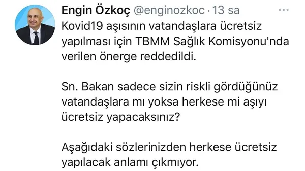 CHP Grup Başkanvekili Engin Özkoç, Sağlık Bakanı Dr. Fahrettin Koca'nın ücretsiz aşı yapılacağını açıklamasına rağmen, "Kovid19 aşısının vatandaşlara ücretsiz yapılması için TBMM Sağlık Komisyonu'nda verilen önerge reddedildi. Sn. Bakan sadece sizin riskli gördüğünüz vatandaşlara mı yoksa herkese mi aşıyı ücretsiz yapacaksınız? Aşağıdaki sözlerinizden herkese ücretsiz yapılacak anlamı çıkmıyor" dedi.