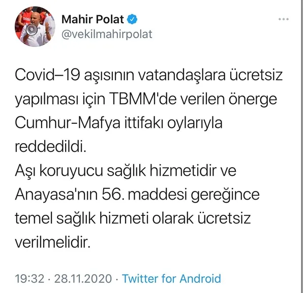 CHP İzmir Milletvekili Mahir Polat ise, "Kovid–19 aşısının vatandaşlara ücretsiz yapılması için TBMM'de verilen önerge Cumhur-Mafya ittifakı oylarıyla reddedildi. Aşı koruyucu sağlık hizmetidir ve Anayasa'nın 56. maddesi gereğince temel sağlık hizmeti olarak ücretsiz verilmelidir" dedi.