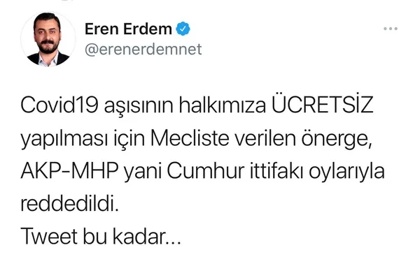 CHP PM Üyesi Eren Erdem sosyal medyadan, "Kovid19 aşısının halkımıza ücretsiz yapılması için Mecliste verilen önerge, AKP-MHP yani Cumhur ittifakı oylarıyla reddedildi. Tweet bu kadar" diyerek algıyı sürdürdü. HDP_ ekonomi hesabı ise, "Tüm yurttaşlara ücretsiz Covid 19 aşısı yapılabilmesi için verdiğimiz önerge AKP-MHP oylarıyla reddedildi. Halkın sağlığı için bütçe istiyoruz. Sağlık kamusal bir haktır diyoruz!" diyerek algı oluşturmaya çalıştı.