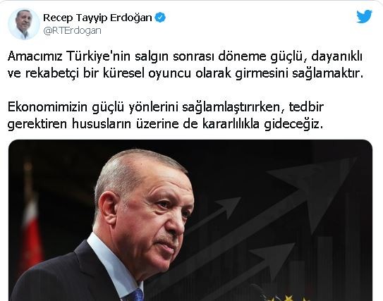 Başkan Erdoğan, yaptığı paylaşımda, 'Amacımız Türkiye'nin salgın sonrası döneme güçlü, dayanıklı ve rekabetçi bir küresel oyuncu olarak girmesini sağlamaktır.