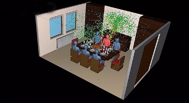 Çalışmada 4.9 metre uzunluğunda, 3.7 metre genişliğindeki bir odada yemek için toplanan 6 kişi bulunuyor. Bu kişilerden biri asemptomatik bir corona virüsü taşıyıcısı. Simülasyonun bir bölümünde kapı ve camlar kapalı şekilde oturulurken, diğer bölümde ise iki cam ve kapı açık şekilde gösteriliyor. Her iki durumda da virüsün yayılma hareketi 10 dakikalık periyotta izleniyor.