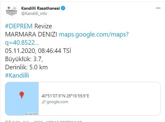 Marmara Denizi'nde deprem olduğu açıklandı! Kandilli Rasathanesi tarafından aktarılan son dakika bilgisine göre depremin Marmara Denizi'nde olduğu ifade edildi. İstanbul'da da deprem hissedildi. Depremin ardından özellikle sosyal medyada vatandaşlar sabah saatlerinde yaşadıkları paniği anlattı. Son dakika açıklamasında bulunan Kandilli Rasathanesi depremin şiddetini 3.7 olarak revize etti. Öte yandan depremin nerede olduğu da harita ile paylaşıldı.