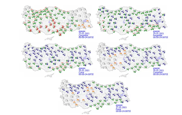 Meteoroloji Genel Müdürlüğü tarafından yapılan son değerlendirmelere göre: Marmara'nın güney ve doğusu, Ege, Akdeniz, İç Anadolu, Karadeniz, Doğu Anadolu'nun batısı, Güneydoğu Anadolu ile Erzurum, Muş, Bingöl çevreleri ve Edirne'nin güney kesimlerinin yağışlı geçeceği tahmin ediliyor. Yağışların sağanak ve gök gürültülü sağanak, Batı Karadeniz'in iç kesimleri, İç Anadolu'nun kuzeyinin yüksekleri, Erzurum çevreleri ve Edirne'nin güney kesimlerinde yer yer karla karışık yağmur ve kar olmak üzere İç Ege, Akdeniz, İç Anadolu, Batı ve Orta Karadeniz ile Muğla'nın doğu ilçeleri, Giresun, Malatya, Elazığ, Erzincan, Tunceli ve Bingöl çevrelerinde yerel olarak kuvvetli olması bekleniyor. Sabah saatlerinde Doğu Anadolu'nun doğusunda buzlanma ve don olayı ile birlikte, yer yer pus ve sis olayı bekleniyor.