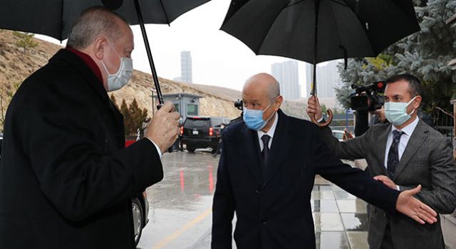 Erdoğan’ın resmi programında yer almayan ziyaret dün akşam saatlerinde gerçekleşti. MHP lideri Bahçeli’nin Beytepe’deki evinde basına kapalı gerçekleşen ziyaret yaklaşık 50 dakika sürdü. Bahçeli, Cumhurbaşkanı Erdoğan’ı kapıda karşılarken; görüşmede terörle mücadeledeki gelişmeler, yeni ve sivil anayasa çalışmaları, İnsan Hakları Eylem Planı, HDP’li milletvekilleri hakkındaki fezlekeler ve Türkiye gündeminde yer alan diğer konuların ele alındığı belirtildi. Ev ziyareti ile birlikte Erdoğan ve Bahçeli son iki gün içinde iki defa bir araya gelmiş oldu. Erdoğan, Bahçeli ile 2 Mart Salı günü İnsan Hakları Eylem Planı’nı açıkladığı tanıtım toplantısından hemen sonra görüşmüştü. Erdoğan Bahçeli’yi evinde en son 5 Ocak’ta ziyaret etmiş, süpriz buluşma yaklaşık 1 saat 10 dakika sürmüştü.