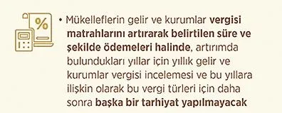 Mükelleflerin gelir ve kurumlar vergisi matrahlarını artırarak belirtilen süre ve şekilde ödemeleri halinde, bu vergi türleri için daha sonra başka bir tarhiyat yapılmayacak. Gayrimenkuller ile amortismana tabi diğer iktisadi kıymetler için yeniden değerlendirme imkânı sağlanarak, bu kıymetler bilançolarda güncel değerleriyle yer alacak.