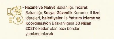 Kanuna göre Hazine ve Maliye Bakanlığı, Ticaret Bakanlığı, Sosyal Güvenlik Kurumu, il özel idareleri, belediyeler ile Yatırım İzleme ve Koordinasyon Başkanlığı'na 30 Nisan 2021'e kadar olan bazı borçlar yapılandırılacak.