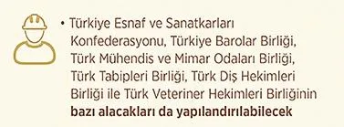 TESK, Türkiye Barolar Birliği, Türk Mühendis ve Mimar Odaları Birliği, Türk Tabipleri Birliği ve Türk Diş Hekimleri Birliği'nin bazı alacakları da yapılandırılabilecek.