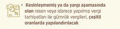 Düzenlemenin yayımından önce başlanan ancak tamamlanmayan vergi incelemeleriyle takdir işlemlerine devam edilecek, bu işlemlerin tamamlanmasından sonra tarh edilen vergiler yapılandırılacak.