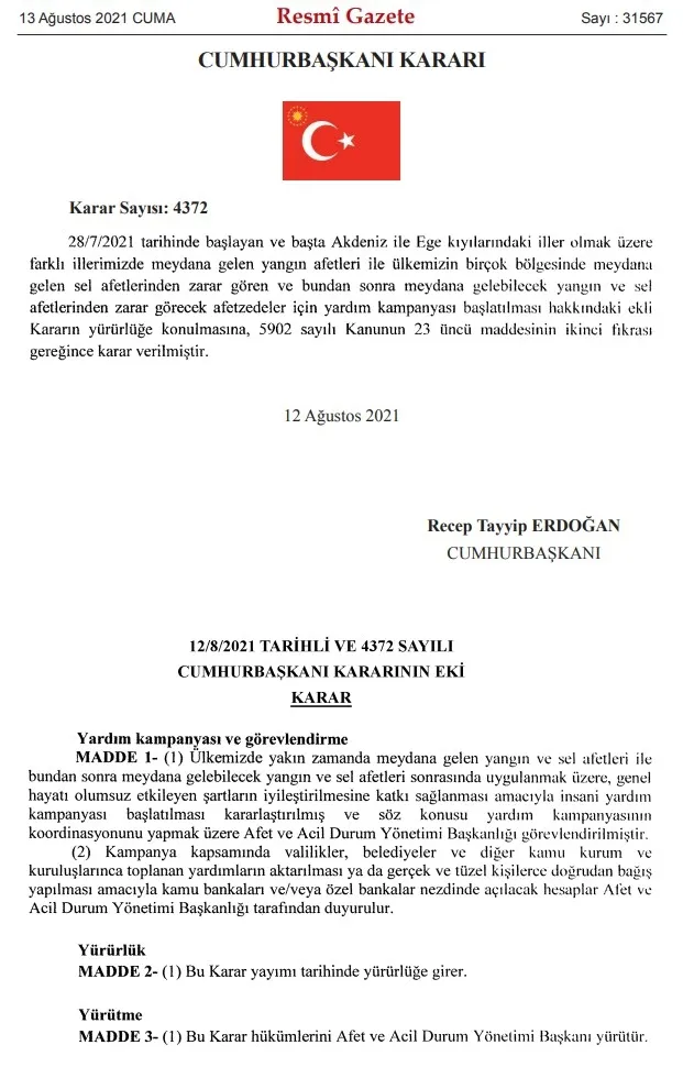 Cumhurbaşkanı Recep Tayyip Erdoğan'ın imzasıyla yayımlanan karara göre, Türkiye'de yakın zamanda yaşanan yangın ve seller ile bundan sonra meydana gelecek benzeri afetler sonrasında uygulanmak üzere, genel hayatı olumsuz etkileyen şartların iyileştirilmesine katkı sağlaması amacıyla insani yardım kampanyası başlatılacak.