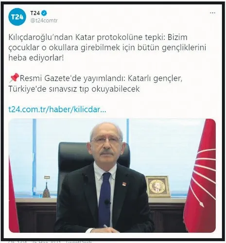 Kemal Kılıçdaroğlu, milyonlarca öğrencinin sınava gireceği cumartesi gününün arifesinde sosyal medya hesabından "Protokol onaylandı: Katarlı gençler Türkiye'de sınavsız tıp okuyabilecek" şeklinde bir haber paylaştı.