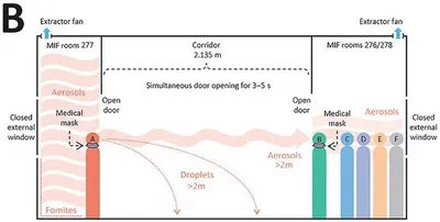 Bu çizim aynı otelin aynı koridorunda farklı odalarda kalmış ve hiç temas kurmamış kişiler arasında teyit edilen virüs bulaşmasını gösteriyor.
