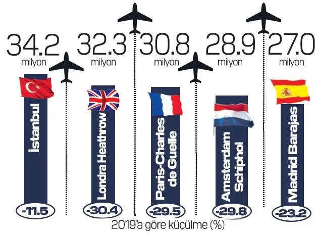 İGA Havalimanı CEO'su Kadri Samsunlu ile birlikte sohbet toplantısı düzenleyen Jankovec'in verdiği bilgiye göre, Londra Heathrow Havalimanı'nda yolcu sayısı ocak-temmuzda 32.3 milyon oldu. 2019'a göre küçülme yüzde 30.4. Paris-Charles de Gaulle Havalimanı'na 30.8 milyon yolcu geldi. 2019'a göre hala yüzde 29.5 küçülme var. Amsterdam Schiphol Havalimanı'nı 28.9 milyon yolcu kullandı. Küçülme yüzde 29.8. Madrid Barajas Uluslararası Havalimanı'na da ocak-temmuzda 27 milyon yolcu geldi, 2019'a göre yolcu sayısında küçülme yüzde 23.2'i buldu. Frankfurt Havalimanı'nın ilk beşe dahi girememesi dikkat çekti.