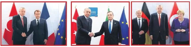 Başkan Erdoğan, G20 Liderler Zirvesi'nde "Küresel Ekonomi ve Küresel Sağlık" temalı özel oturumda yer aldı. Oturum öncesinde ABD Başkanı Joe Biden, Almanya Başbakanı Angela Merkel, İngiltere Başbakanı Boris Johnson, Hindistan Başbakanı Narendra Modi ve BM Genel Sekreteri Antono Guterres ile bir süre ayaküstü sohbet eden Erdoğan, ilk olarak AB Komisyonu Başkanı Ursula von der Leyen ile bir araya geldi. Ardından İtalya Başbakanı Mario Draghi'yi kabul etti. Hollanda Başbakanı Mark Rutte'yi de kabul eden Erdoğan, Endonezya Cumhurbaşkanı Joko Widodo ile bir araya geldi. Zirvenin ikinci gününde Erdoğan, Biden ile bir araya geldi. Fransa Cumhurbaşkanı Emmanuel Macron ve AB Konseyi Başkanı Charles Michel ile de görüşen Erdoğan son olarak Merkel ile bir araya geldi. Görüşmede, Almanya'da yeni koalisyon hükümetini kurmak için müzakereleri sürdüren Olaf Scholz da yer aldı.