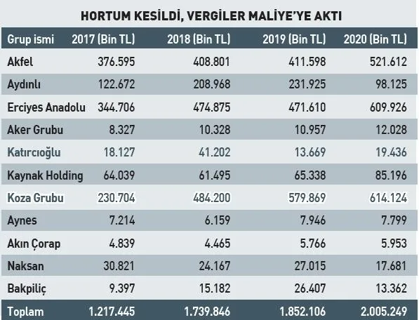 2017, 2018, 2019 ve 2020 yıllarında Koza Grubu, Erciyes Anadolu, Kaynak Holding, Aydınlı, Naksan Grubu gibi şirketlerden toplam 7 milyara yakın vergi geliri sağlandı. Vergi ödenmeye başladıkça Erciyes Anadolu Holding, Koza-İpek Holding ve Aydınlı Hazır Giyim şirketleri Kurumlar Vergisi rekortmenleri listelerinde de üst sıralara çıktı.