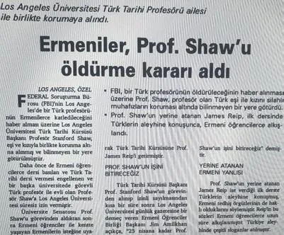 Shaw, Ermeni tezlerini kabul etmeyince 1982 yılında Ermeniler tarafından katledileceği istihbaratını alan FBI, profesörü koruma altına aldı. Los Angeles Üniversitesi, Stanford Shaw'a süresiz izin verip, yerine Ermeni tezlerini savunan James Reip'i getirdi.