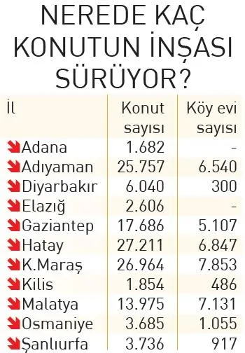 Hatay'da 27 bin 211, Kahramanmaraş'ta 26 bin 964, Kilis'te bin 854, Malatya'da 13 bin 975, Osmaniye'de 3 bin 685, Şanlıurfa'da 3 bin 736 konutun yapımına TOKİ ve Emlak Konut eliyle başlandı. Adıyaman'da 6 bin 540,