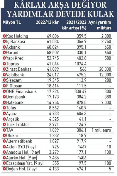 Halbuki, bakıyorsunuz 2022 bilançolarına… Hepsinin kârı arşa değmiş… Bugüne kadar bilanço açıklaması yapan borsadaki dev şirketlerin kârına bakalım. 2022'de 1 milyar liranın üzerinde kâr eden 40 şirket var. (Bir kısmı henüz açıklamadı) Açıklama yapanların kârı yarım trilyon liraya gelmiş durumda. 2021'de kârları 126.7 milyar iken, 2022'de 548.1 milyar liraya çıkmış. Artış yüzde 332.5. Yani enflasyonun beş katı… Peki ya yardımları?