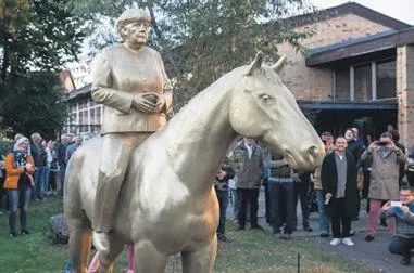 16 yılın ardından görevi bırakmaya hazırlanan Almanya Şansölyesi Angela Merkel'in at üzerinde betimlenmiş heykeli yapıldı. 3D baskı teknolojisiyle yapılan altın renkli heykel 2.7 metre uzunlukta.