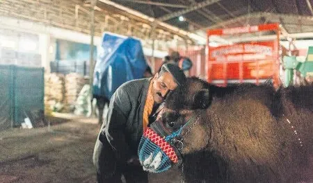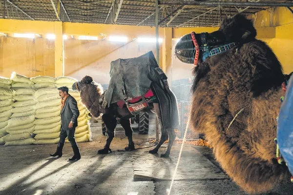 Deve terbiyecisi Yılmaz Bıçak, güreş müsabakası öncesi hayvanıyla ilgileniyor. Eğitmenler, güvenliklerini ve rahatlıklarını sağlamak için genellikle ahırlarda develeriyle uyuyorlar.