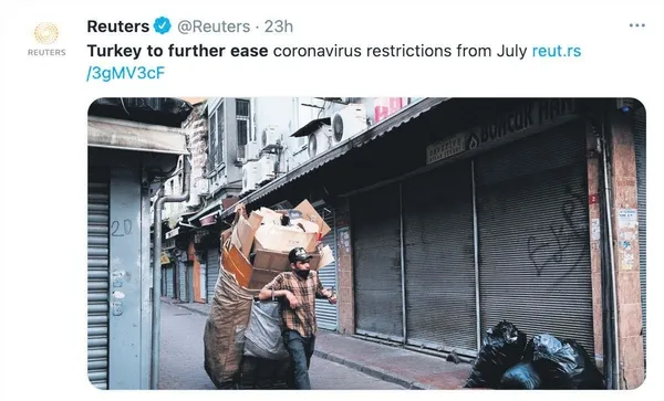 Dünyaca ünlü Reuters haber ajansı Twitter'dan "Turkey to further ease restrictions from July..." (Türkiye Temmuz'dan itibaren kısıtlamaları daha da gevşetecek) spotlu bir haber paylaşmış. Haberde fotoğraf olarak çöp torbalarının, kepenkleri inmiş dükkanların ve sokakta kağıt toplayan bir gencin olduğu kasvetli bir sokak fotoğrafı paylaşılmış.