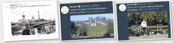 Aynı haber ajansının kısıtlamalar ve kısıtlamaların hafifletilmesiyle ilgili farklı tarihlerde İngiltere, İrlanda ve Fransa ile ilgili yaptığı haber paylaşımlarında kullandığı fotoğraflar ise cıvıl cıvıl, sevimli, insana yaşam enerjisi veriyor. Örneğin İngiltere'de insanlar güzel havanın tadını çıkarmak için çimenlere oturmuşlar. İrlanda'da bir anne ve çocuğu yemyeşil bir parkta ördeklere bakıyor. Sanki kartpostal fotoğrafı gibi. Fransa- Paris'te gençler nehir kenarında toplanmış, normalleşmenin tadını çıkarıyorlar.