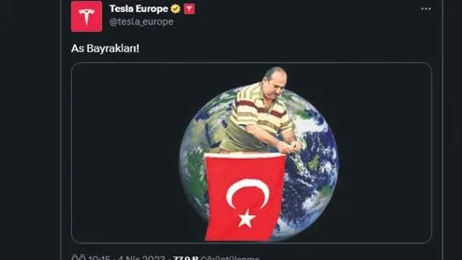 Tesla Motor'un Avrupa Twitter hesabından Türkiye piyasasına açılma şerefine yapılan paylaşım da yerli ve milli anlayıştan kopya çekmiş sanki. 'Balkona bayrak asan dayı' görseliyle "As bayrakları" sloganı ile paylaşıldı.