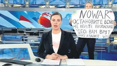 Rusya'nın devlet televizyonu Kanal 1'de geçtiğimiz pazartesi akşamı tarihi bir an yaşandı. Editör Marina Ovsyannikova, canlı yayında spikerin arkasına geçerek "Savaşı durdurun. Propagandaya inanmayın. Size burada yalan söylüyorlar" yazılı pankart açtı.
