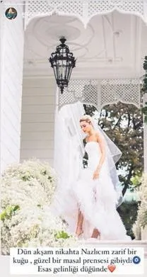 Arzu Sabancı ise Instagram'dan gelininin fotoğrafını paylaşıp "Dün akşam nikahta Nazlı'cım zarif bir kuğu, güzel bir masal prensesi gibiydi. Esas gelinliği düğünde" diye yazdı. Bu paylaşım kaynana da gelinliği beğenmedi olarak algılandı.