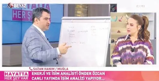 ■ Nur Viral'in sunduğu 'Hayatta Her Şey Var' programına konuk olan Enerji ve İsim Analisti Önder Özcan'a canlı yayında Suzan adlı bir kadın, eşiyle uyumuna bakmasını istedi.